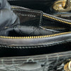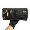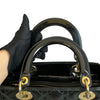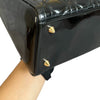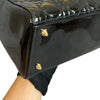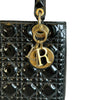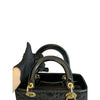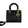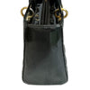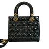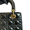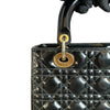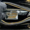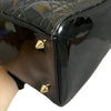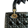 This is an authentic Christian Dior Lady Dior Medium Patent Cannage in Black. This chic tote is crafted of geometric quilted patent leather in black. The handbag features a shoulder strap, sturdy patent leather top handles with gold hardware, and hanging Dior logo charms. The top zipper opens to a black monogrammed fabric interior with a zipper pocket.