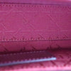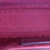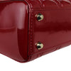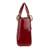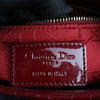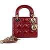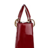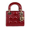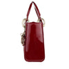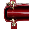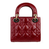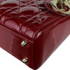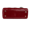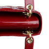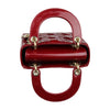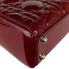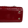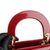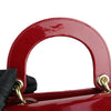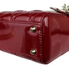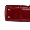 This is an authentic Christian Dior Lady Dior Mini Patent Cannage in Red. This handbag is made of red patent leather with a geometric quilted design. It has matching leather top handles, a removable shoulder strap, and gold hardware. The flap opens to reveal a red Dior monogram fabric interior with a zipper pocket.