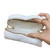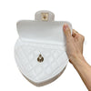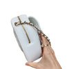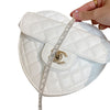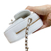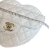 The Large Chanel Heart Bag is made from diamond quilted white lambskin with a woven chain leather strap. The body is heart-shaped and irresistible. The front features a single flap with an exterior smile pocket at the back. The top comes with a double zip, but one zip is accentuated with a golden heart-shaped charm.