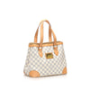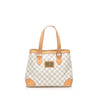 The Louis Vuitton Hampstead PM features the Damier Azur canvas body with Vachetta trim, flat Vachetta straps, an open-top, a gold-tone hardware detail, and interior zip and slip pockets.