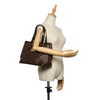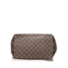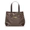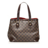 The Louis Vuitton Hampstead MM features a damier ebene canvas, flat leather handles, an open top, and interior zip and slip pockets.