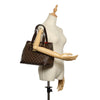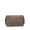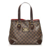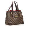 The Louis Vuitton Hampstead MM features a damier ebene canvas, flat leather handles, an open top, and interior zip and slip pockets.