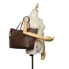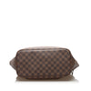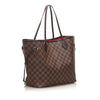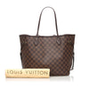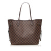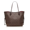 The Louis Vuitton Neverfull MM features the Damier Ebene canvas body with leather trim, flat leather straps, a top lobster claw clasp closure, and an interior zip pocket.