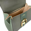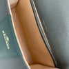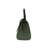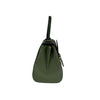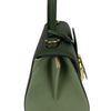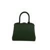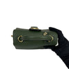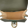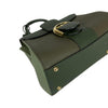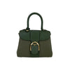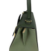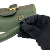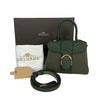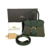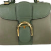 This Delvaux Brillant Mini Sellier bag with gold-tone hardware has been designed in green grained leather. It features detachable flat shoulder strap, a stylized D-buckle on the flat front, single rolled top handle, creme leather lining, single slit pocket at interior wall and buckle closure at front flap. The winged gusseted sides, and protective metal feet add a stylish finish to this compact handbag.