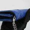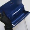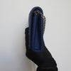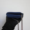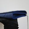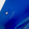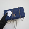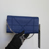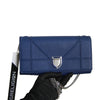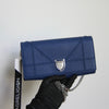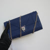 This Dior Diorama WOC is crafted of finely pebbled calfskin leather in dark blue. It has a removable chain-link strap. The flap is embossed with linear outlines that run across the bag’s body, giving it a structured style. Use this as a crossbody bag in for mid-day hangouts or a clutch for a more formal look.
