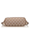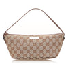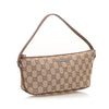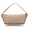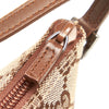 The Boat baguette features a canvas body with leather trim, a flat leather handle, and a top zip closure.