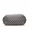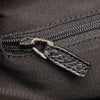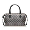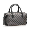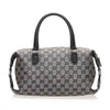 This handbag features a canvas body with leather trim, rolled leather handles, top zip closure and interior zip pocket.
