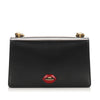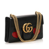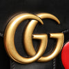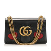 This Gucci GG Marmont Shoulder Bag features a leather body with heart detail, a gold-tone chain strap, a front flap with a magnetic closure, an interior top zip compartment, and an interior zip pocket.