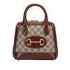 Gucci GG Supreme Horsebit Satchel Brown. This satchel features a coated canvas body with leather trim and front horsebit detail, rolled leather handles, a detachable flat leather strap, a zip around closure, and interior zip and slip pockets.
