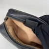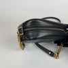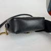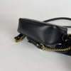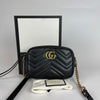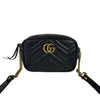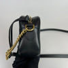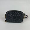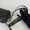 This Gucci Mini GG Marmont Camera Bag's exterior is made with black Matelassé Chevron Leather with Double G hardware. It has an adjustable chain shoulder strap, a top zip, a slip pocket, and a microfibre lined interior. Its simple black aesthetic makes it ideal for casual chic get-ups.