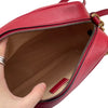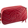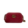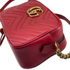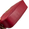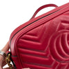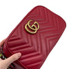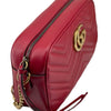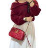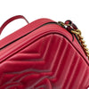 The GG Marmont Camera Small Matelassé Hibiscus Red features a quilted leather body, a gold toned chain strap, and a top zip closure. The chain strap can be worn as a shoulder or a crossbody.