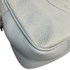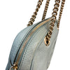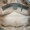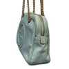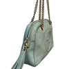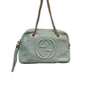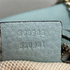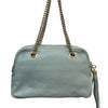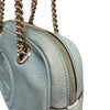 This is an authentic Gucci Soho Bowler Small Pebbled Calfskin in Light Blue. This chic shoulder bag is made of fine-grained calfskin leather, with an interlocking embossed GG logo on the front. The bag features light gold chain shoulder straps and a leather tasseled zipper pull that opens to a natural fabric interior with zipper and patch pockets.
