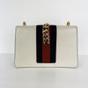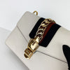 This Gucci Sylvie Small Shoulder Bag features a detachable shoulder strap, nylon web details, metal chain and button closure. It has a gorgeous interior open pocket for all your daily essentials.  This bag includes two straps that can be mixed and matched to deliver a variety of different looks by converting from top handle to shoulder bag.