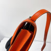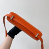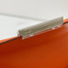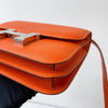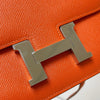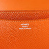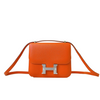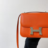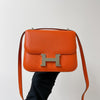 This Hermes Constance 18 in Classic Orange features a leather body, silver-tone logo hardware, a front flap with the iconic "H" magnetic closure, and interior zip and slip compartments.