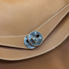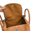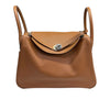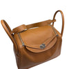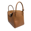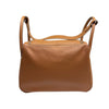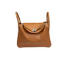 This is an authentic Hermes Lindy 30 Taurillon Clemence in Gold. This stylish bag is made of fine calfskin leather. The bag features rolled leather top handles, connected with a unique looping shoulder strap and Palladium hardware. The top zippers open to a leather interior with pockets.
