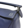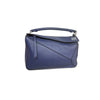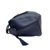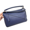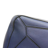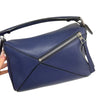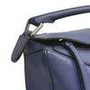 This is an authentic Loewe Puzzle Small Calfskin Quilted in Navy. This stunning bag is made of calfskin leather. The bag features a rolled leather handle, a rear zipper pocket a leather shoulder strap with polished silver hardware. The top zipper opens to a beige fabric interior with patched pockets.
