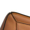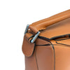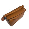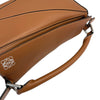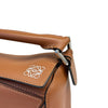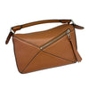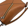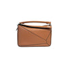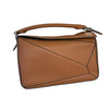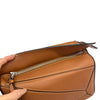 This is an authentic Loewe Puzzle Small Calfskin Quilted in Tan. This stunning shoulder bag is made of calfskin leather in brown. The bag features a rolled leather handle, a rear zipper pocket, and a adjustable leather shoulder strap with polished silver hardware. The top zipper opens to a natural fabric interior with a patch pocket.