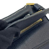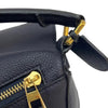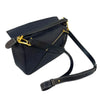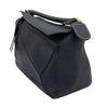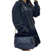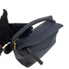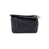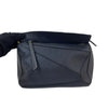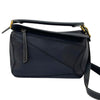 This is an authentic Loewe Puzzle Small Crossbody Calfskin in Midnight Blue. This stunning bag is made of grained calfskin leather. The bag features a rolled leather handle, a rear zipper pocket, and a leather shoulder strap with polished gold hardware. The top zipper opens to a beige fabric interior with patched pockets.