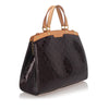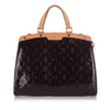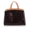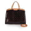 This Louis Vuitton stylish Brea GM handbag is crafted of Louis Vuitton monogram-embossed patent Vernis leather in burgundy. It features natural vachetta cowhide leather trim, top handles, and an optional, adjustable shoulder strap with polished brass hardware. The top zipper opens the bag to a burgundy fabric interior with zipper and patch pockets.