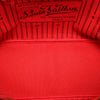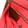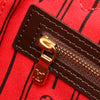 The Neverfull MM features the Damier Ebene canvas body with leather trim, red interior, a flat leather straps, a top lobster claw clasp closure, and an interior zip pocket.
