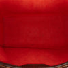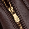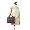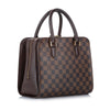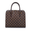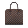 The Louis Vuitton Damier Ebene Triana Brown features a damier canvas body, rolled leather handles, a top zip closure, and an interior zip pocket.