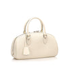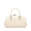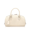 The Louis Vuitton Epi Jasmine in White features an epi leather body, a rolled leather handles, a top zip closure, and an interior slip pocket.