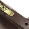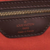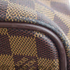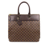The Louis Vuitton Greenwich PM features a damier canvas body with leather trim, rolled leather handles, a top zip closure, and an interior zip pocket.