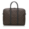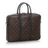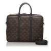The Louis Vuitton Monogram Macassar Porte-Documents Jour features a monogram canvas body, rolled leather handles, a top zip around closure, and interior slip pockets.