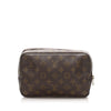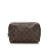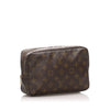 The Louis Vuitton Cosmetic Pouch Trousse Toilette features a monogram canvas body, a top zip closure, and interior slip pockets.