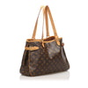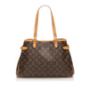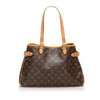 The Batignolles features a monogram canvas body, flat leather straps, side belt details, an open-top, and interior zip and slips pockets.