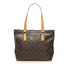 The Louis Vuitton Cabas Piano features a monogram canvas body, flat leather straps, a top zip closure, and interior zip and slip pockets.