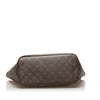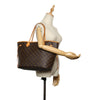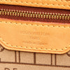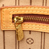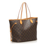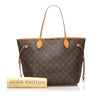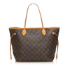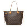 The Louis Vuitton Neverfull MM features a monogram canvas body, flat leather handles, a top lobster claw clasp closure, and an interior zip pocket.