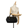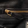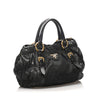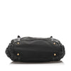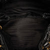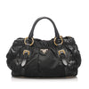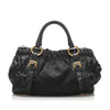 This satchel features a nylon and gathered leather body, rolled leather handles, a detachable flat leather strap, a top magnetic snap button closure, and interior zip and slip pockets.