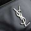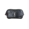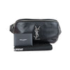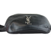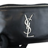 This is an authentic Saint Laurent Belt Bag Calfskin Monogram in Black. This sleek belt bag is made of smooth black calfskin leather, featuring an adjustable strap and silver hardware with a prominent YSL monogram on the front. The top zipper reveals a compact black fabric interior with a patch pocket and card slots.