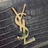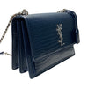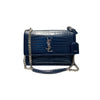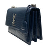 This is an authentic Saint Laurent Sunset Medium Calfskin Crocodile Embossed in Blue. This stunning shoulder bag is crafted of croc embossed calfskin. The bag features a silver chain, a front facing flap with a silver signature YSL logo, gusseted sides, and an exterior pocket. This fold-over bag is complete with a magnetic snap that opens to a partitioned matching suede interior with a patch pocket.