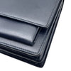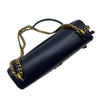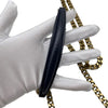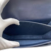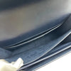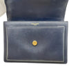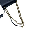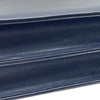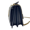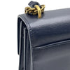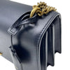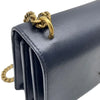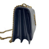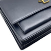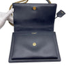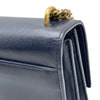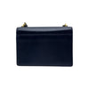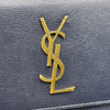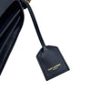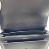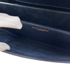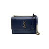This is an authentic Saint Laurent Sunset Medium Calfskin Monogram in Navy. This stylish shoulder bag is made of textured calfskin leather. It has a gold chain strap with a shoulder pad, a front flap with a gold YSL logo, gusseted sides, and pockets inside and outside. The bag features a magnetic snap closure that opens to a suede interior with a patch pocket.