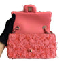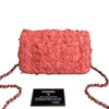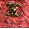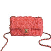 This rare Chanel mini flap bag is crafted in pink fuzzy tweed, a perfect homage to Chanel's iconic suits, and is accentuated with silver toned hardware, prominent Chanel CC turn lock clasp and a long chain strap.