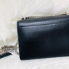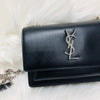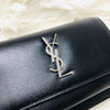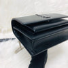 This chic Saint Laurent Flap Bag is made of 100% calfskin leather with accordion sides and has a leather strap that can be worn crossbody or doubled on the shoulder, making it a stylish versatile fashion accessory. It has a leather-encased key ring and metal interlocking YSL signature on the front flap with oxidized nickel hardware.