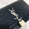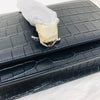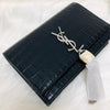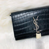 This WOC Classic Monogram Kate Tassel Satchel from Saint Laurent is a stunning piece made from crocodile embossed calfskin leather. It has 6 card slots and 1 coin pocket. It has a polished silver chain link crossbody shoulder strap and a flap with a polished silver signature YSL logo that has a silver knobbed miniature silver chain tassel.