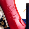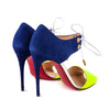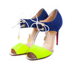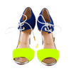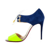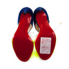 The Christian Louboutin Mayerling Bicolor flourescent sandal is the perfect pair of for an adventurous fashionista. Done with a bold color medley of neon yellow and electric blue, these heels are a gorgeous statement piece. We love the combination of suede for the blue top-line and leather fluorescent toe-strap. A 4” covered stiletto heel and open toe make for a feminine silhouette. Wear yours with anything from denim to dresses.