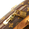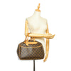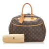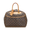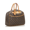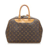 The Deauville features a monogram canvas body, an exterior front slip pocket, rolled leather handles, a top zip closure, and an interior open pockets.