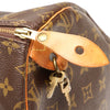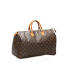 The Speedy 40 features a monogram canvas body, rolled leather handles, a top zip closure, and an interior slip pocket.