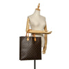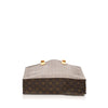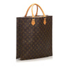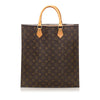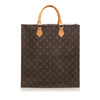 The Sac Plat features a monogram canvas body, rolled leather handles, an open top, and an interior slip pockets.