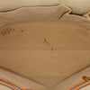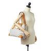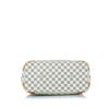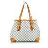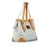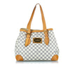 This Louis Vuitton Hampstead PM features the Damier Azur canvas body with vachetta trim, a flat vachetta straps, an open top, a gold-tone hardware detail, and an interior zip and slip pockets.