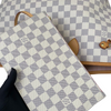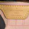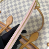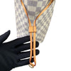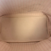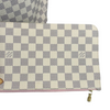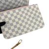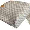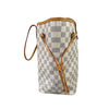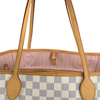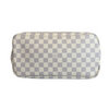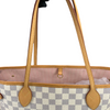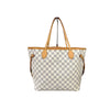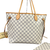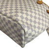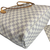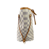 The Louis Vuitton Neverfull MM features the Damier Azur canvas, vachetta straps and trim, side drawstrings, an open top with a lobster claw clasp, and an interior zip pocket.