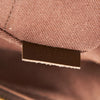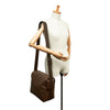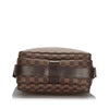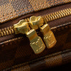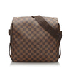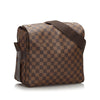 The Louis Vuitton Naviglio features a damier ebene canvas body, flat strap, top flap with snap closure, top zip closure, and an interior slip pocket.
