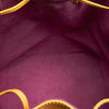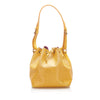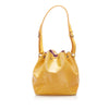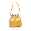 The Louis Vuitton Petit Noe bucket bag features Epi leather, an adjustable shoulder strap, a drawstring closure, Alcantara lining, and an interior zip pocket.