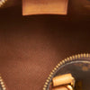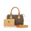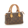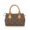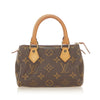 The Mini Speedy features a monogram canvas body, rolled leather handles, and a top zip closure.