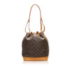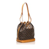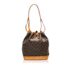 This classic Louis Vuitton bucket style Noe shoulder bag is crafted of monogram canvas with a vachetta base. The shoulder bag features vachetta cowhide leather including a solid base, an adjustable shoulder strap and top cinch strap with brass hardware. This bag opens to a spacious brown fabric interior.