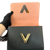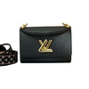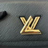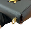 This is an authentic Louis Vuitton Twist MM Shoulder Epi in Black. This stylish shoulder bag is made of textured epi leather in black. The bag has a black matte shoulder strap with a leather pad and a gold LV twist lock on the front flap. Inside, there's a pink microfiber interior with flat pockets.